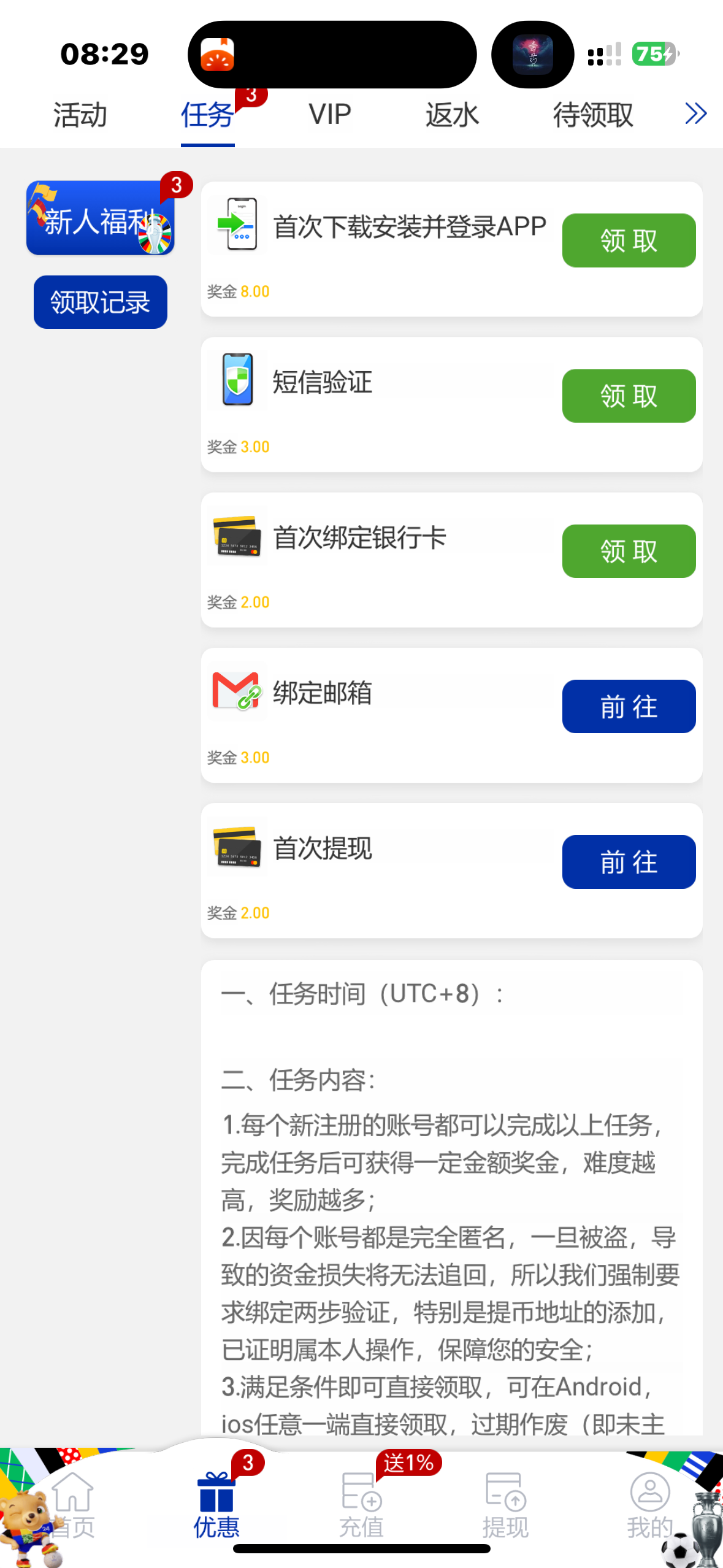 完成任务秒16,提现了再领2块,提现300到了,后面彩金又上200浪没了