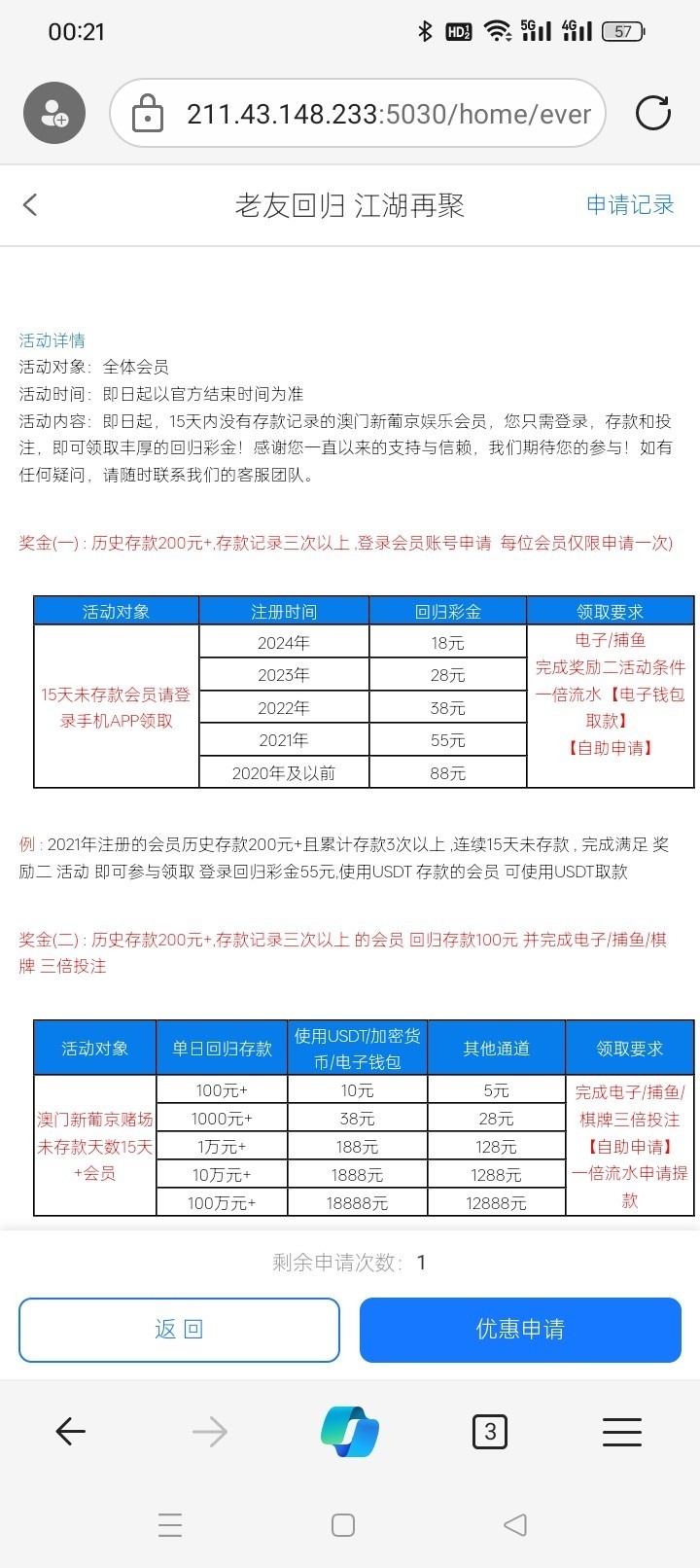奖金一活动,历史存款有200+存款三次以上,可以申请未登录天数回归彩金