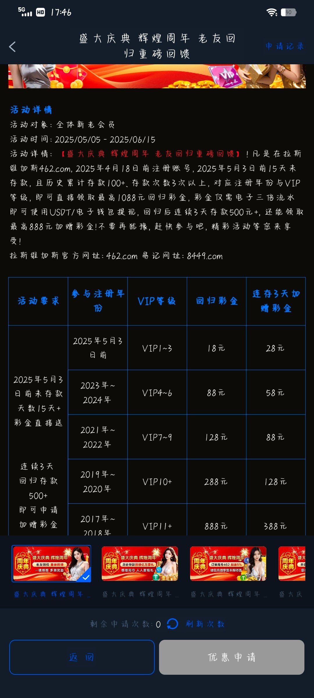要求历史存款100,5月1前15天之内没存款 官网462.com 白嫖即可,切勿充值