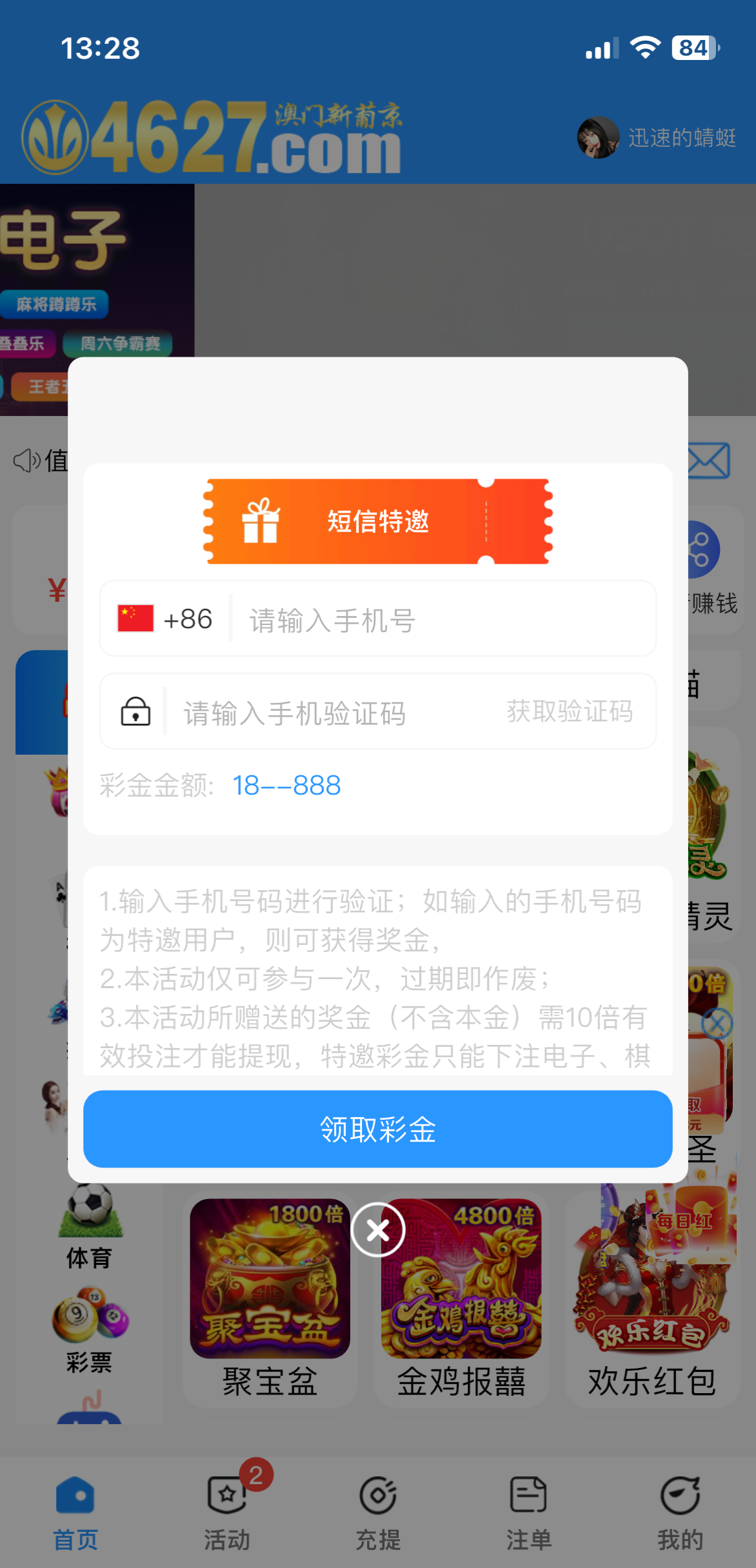 有特邀的自助领取18,没有的可以去旺旺找专员签到都会送,签到第一天送2第二天送6第八天送18,彩金只能打电子棋牌捕鱼没充值的要打六倍水,旺旺专员608031586链接4627h.com