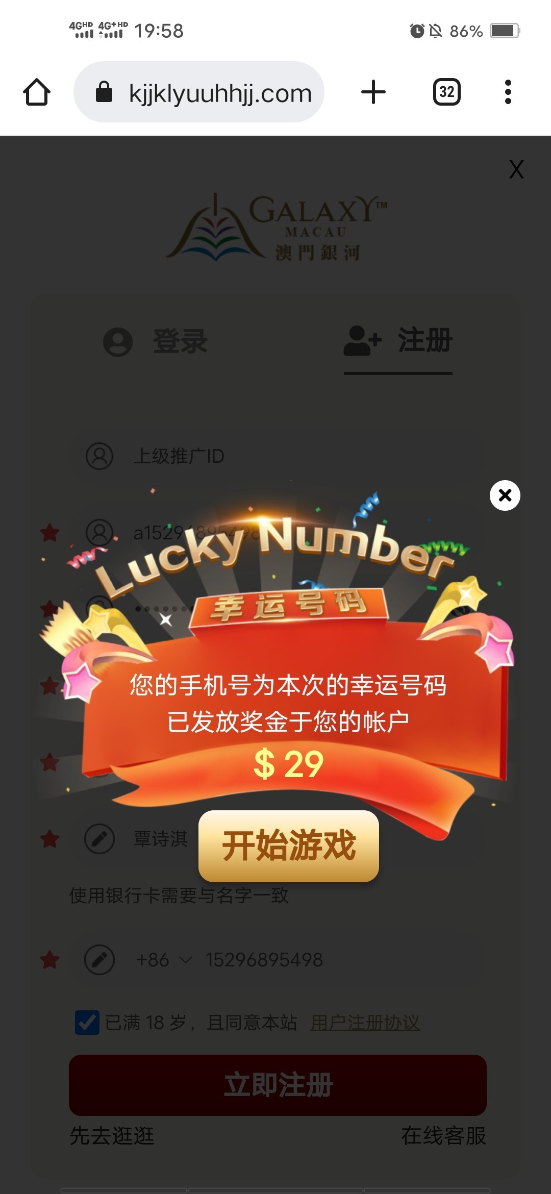 手机号码特邀注册,弹窗秒29,自行测试,出款自测