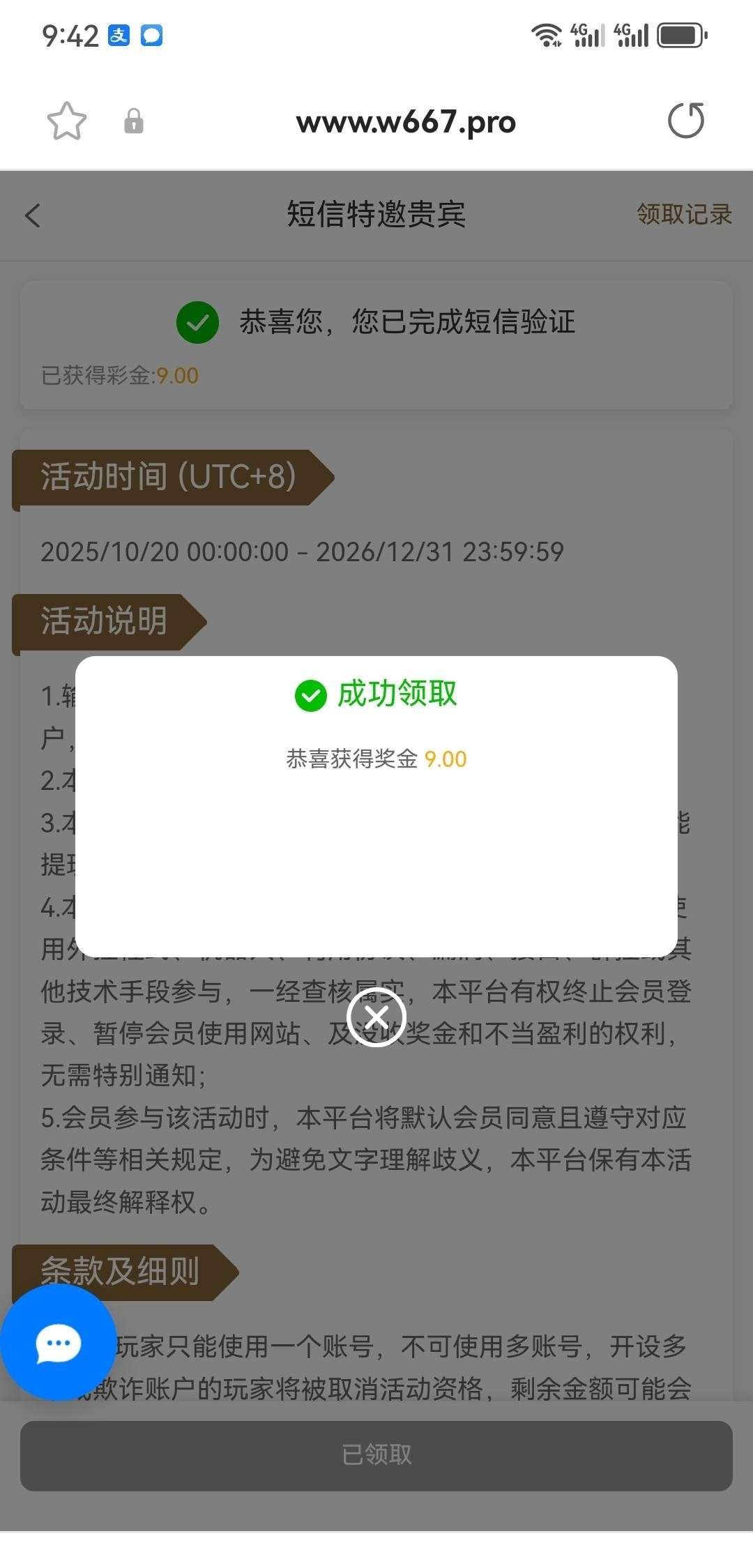 之前送38要充值,现在送9验证就能领。注册直接去活动输入手机号能发码再去绑定手机号!网址截图头顶上w667.pro