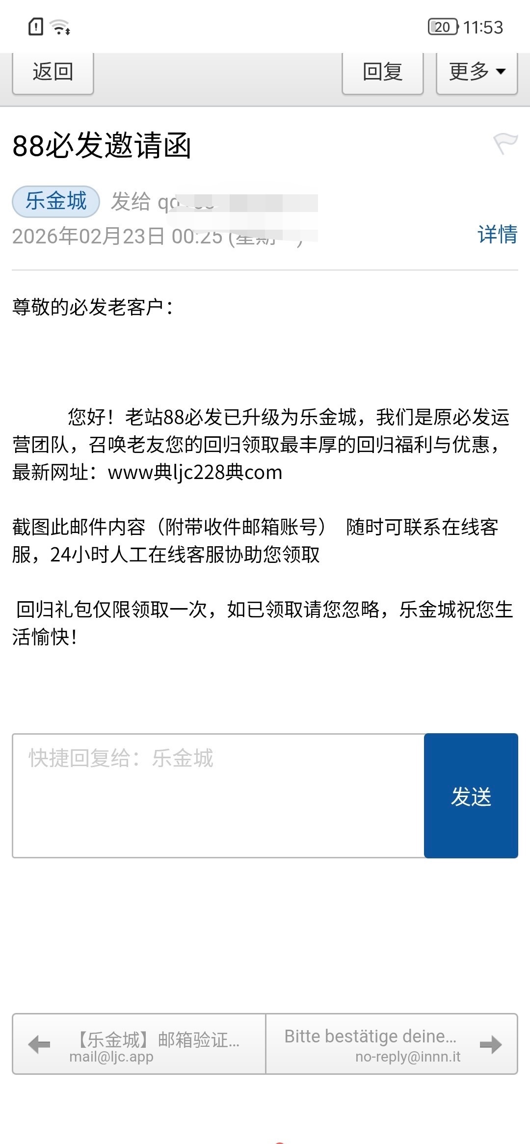 乐金城发邮件送了我188 说是之前的88必发升级,有的可以看看能不能出我也不知道,还没打链接www.ljc228.com