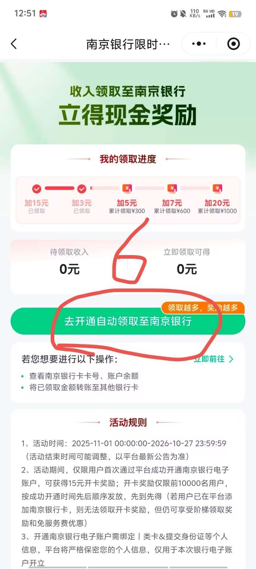 2:下面是教程点我的页面,点待领取进去,点开启自动领取,出来这个页面点开户就行了(自动领取页面一开始没有入口显示,南京银行收入奖励的等半个小时左右再刷新进去就会显示啦)到账啦直接绑定微信提现,不用下载