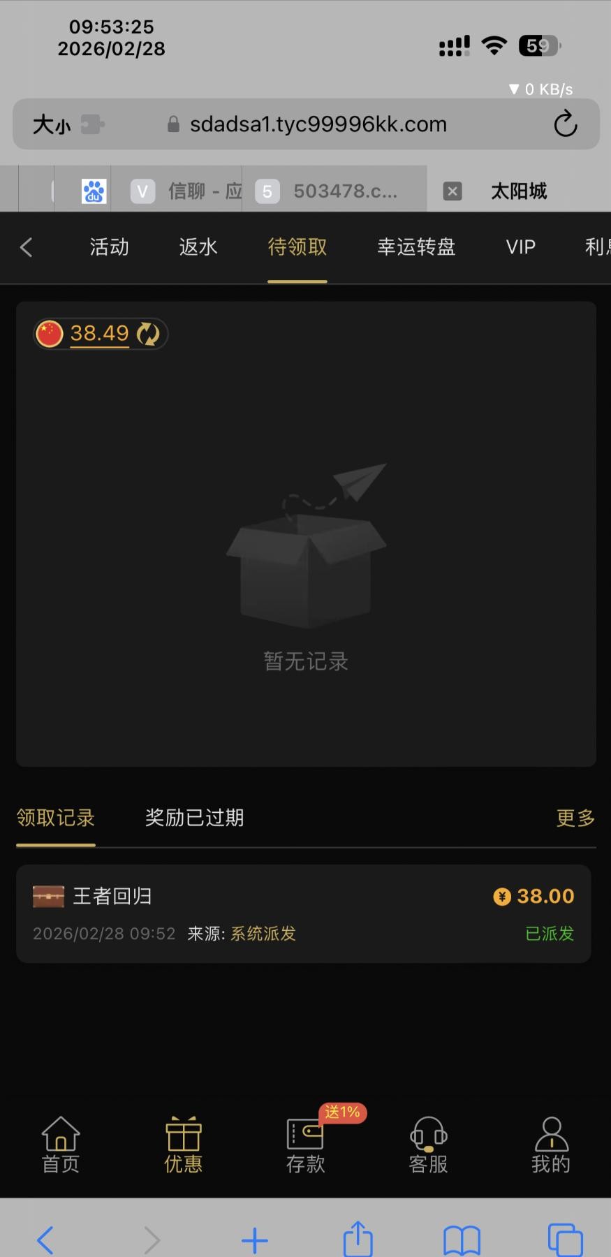 太阳城99996.com,电话回访彩金,电话刚打来的电话,vip1,没充值过,送了38,有号的老哥上号看看