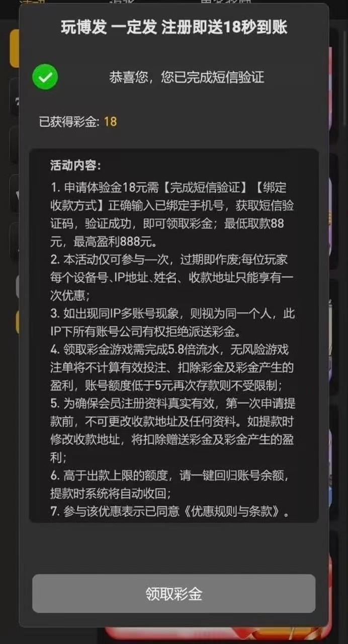 申请体验金18元需【完成短信验证】【绑定收款方式】正确输入已绑定手机号,获取短信验证码,验证成功,即可领取彩金;最低取款88元,最高盈利888元